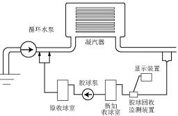 目前,大多數(shù)電廠對(duì)凝汽器的結(jié)垢主要是采用周期性膠球清洗的辦法進(jìn)行處理,即膠球清洗。凝汽器周期性膠球清洗裝置是由收球網(wǎng)、膠球輸送泵、裝球室、控制器、膠球及閥門管路等部件組成的(如圖1所示)。它借助高壓水流的作用將大于凝汽器冷卻管內(nèi)徑的清潔膠球擠過冷卻水管,對(duì)冷卻水管進(jìn)行反復(fù)擦洗,清洗凝汽器冷卻水管內(nèi)污垢并帶出雜質(zhì)。