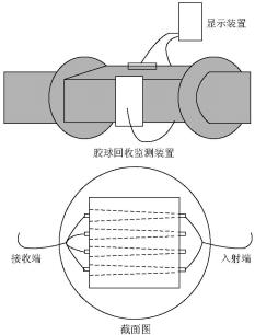 裝置采用對(duì)照式光纖傳感器,無膠球通過時(shí),光纖傳感器的入射端發(fā)出的光線能夠被接收端接收,如果有膠球通過,光線被遮擋,接收端接收不到光線信號(hào),即發(fā)出1個(gè)脈沖信號(hào),該脈沖波信號(hào)傳輸?shù)斤@示裝置增加檢測(cè)膠球數(shù),如圖2所示。