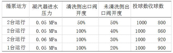 由表3可看出,調(diào)整未清洗側(cè)出口閥開(kāi)度,從而增大清洗側(cè)壓差,膠球清洗裝置同樣可正常運(yùn)行。