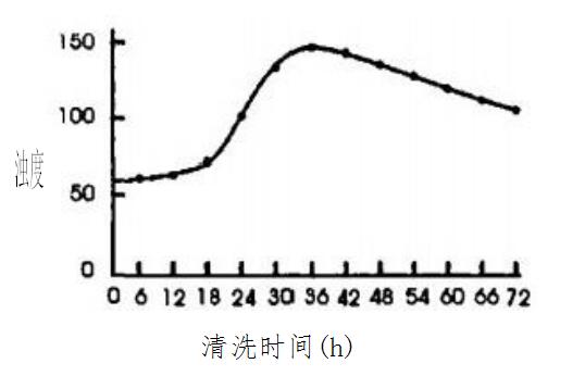 由圖1可知,加入GR-958后,循環(huán)水濁度開始增加。清洗到18h后,濁度呈快速增加趨勢,說明粘泥中的微生物在GR-958作用下失去活性,污泥粘性下降,開始大量分散進(jìn)入水中。清洗到36h時(shí),濁度從開始時(shí)的62mg/L增加到156mg/L,40h后,濁度開始緩慢下降,系統(tǒng)生物粘泥基本洗凈。