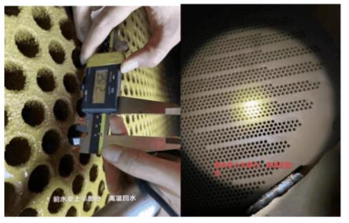 通過檢修期間對(duì)電廠機(jī)組凝汽器內(nèi)部鈦管的檢查發(fā)現(xiàn),凝汽器內(nèi)部鈦管結(jié)垢嚴(yán)重,特別是高溫回水區(qū)域特別明顯。實(shí)際直徑參數(shù)