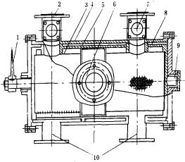 1.操作手柄2.進水管3.收球網(wǎng)4.清洗器外殼5.分水器6.總進水管7.膠球投放口8.換向閥9.銅軸承10.排水管