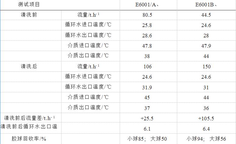 3.1此次清洗先使用Φ18mm膠球,后使用Φ20mm膠球分兩次對(duì)E6001/B、A進(jìn)行清洗,E6001/B小球的回收率為94%(投放膠球210個(gè),回收197只)。從現(xiàn)場(chǎng)目測(cè)的效果看,E6001/B組的循環(huán)水管線結(jié)垢多,清洗出的懸浮物濃度高,水質(zhì)差;E6001/A循環(huán)水中的懸浮物稍少于E6001/B,其循環(huán)水質(zhì)較混。