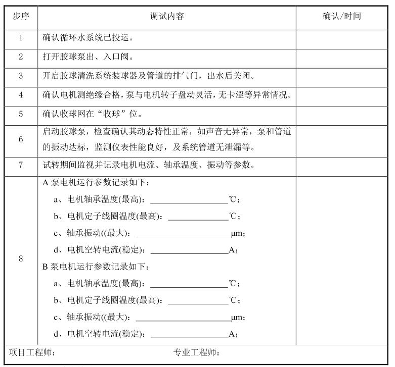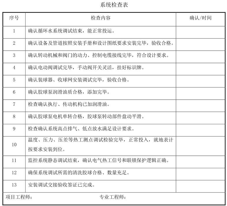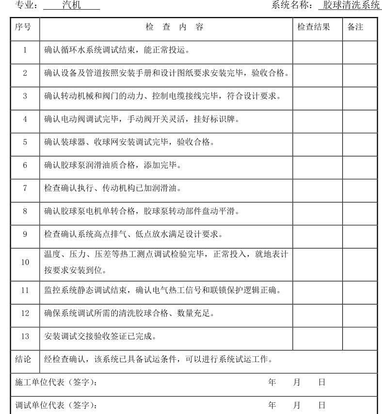 膠球清洗裝置系統(tǒng)試運條件檢查確認(rèn)表