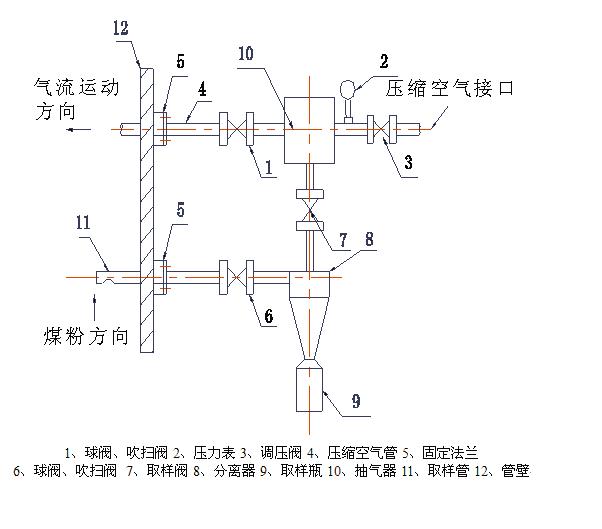 4、取樣閥——飛灰取樣時(shí),將此閥打開,靠壓縮空氣由出氣口排氣形成的氣流,抽吸分離器中的空氣,使其形成負(fù)壓,飛灰從取樣口進(jìn)入取樣裝置,進(jìn)行取樣。