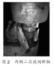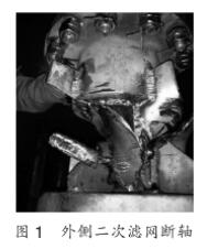 (1)膠球清洗二次濾網(wǎng)動(dòng)力軸和排污斗短軸直徑90mm,軸頸過(guò)小,在連續(xù)旋轉(zhuǎn)過(guò)程中膠球清洗二次濾網(wǎng)受水流沖擊較大,在運(yùn)行過(guò)程中共出現(xiàn)6次動(dòng)力軸和短軸斷裂事故,如圖1和圖2所示。
