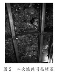 (3)膠球清洗二次濾網(wǎng)網(wǎng)芯孔徑過(guò)小,僅為中8mm,運(yùn)行過(guò)程中垃圾極易造成網(wǎng)芯的堵塞(圖3)。在夏季垃圾.較多時(shí)期,每臺(tái)膠球清洗二次濾網(wǎng)平均每?jī)?周需要清理一次。當(dāng)膠球清洗二次濾網(wǎng)隔離人工清理時(shí),凝汽器鈦管水側(cè)出現(xiàn)斷水,在凝汽器汽側(cè)汽流沖擊下?lián)Q熱管束的振動(dòng)增大,造成管束和管板間磨損。另外,隔離時(shí)鈦管會(huì)出現(xiàn)溫度升高現(xiàn)象,致使鈦管膨脹加長(zhǎng)。由于兩側(cè)管板間距變化較小,鈦管膨脹加長(zhǎng)后會(huì)產(chǎn)生拱起彎曲,與管隔板間的磨損加劇。上述因素極易造成鈦管的磨損穿孔,致使凝汽器出現(xiàn)泄漏,影響機(jī)組整個(gè)汽水系統(tǒng)的安全。