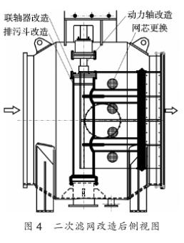 (②動(dòng)力軸改造。將原來(lái)的膠球清洗二次濾網(wǎng)動(dòng)力軸(上軸)更改為雙相不銹鋼材質(zhì)的軸,軸徑由目前的90mm改造為120mm,軸受剪切力F=3.14rσ,其中,σ為屈服強(qiáng)度,r=中/2。經(jīng)過(guò)計(jì)算,新軸剪切力.約為原軸的1.8倍。軸與減速箱連接尺寸不變。