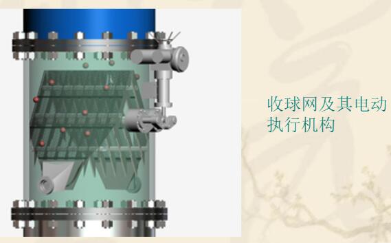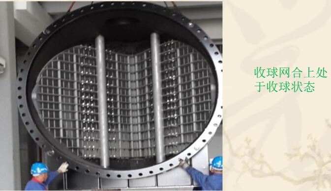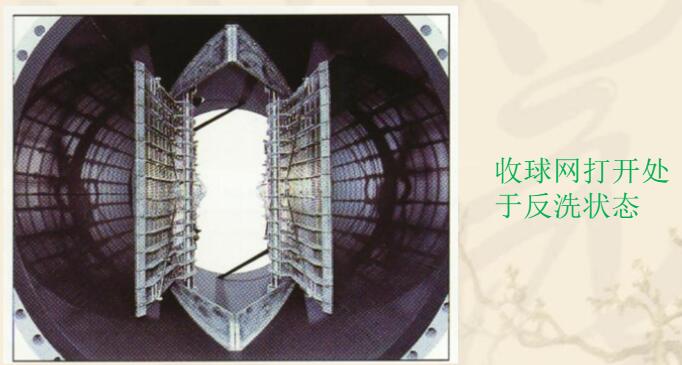 出的夾帶膠球的循環(huán)水經(jīng)過(guò)收球網(wǎng)時(shí),膠球被