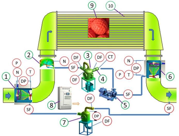 CT:計(jì)數(shù);P:壓力測(cè)量;DP:壓差測(cè)量;DF:電控球閥;SF:手動(dòng)球閥;N:旋轉(zhuǎn)測(cè)量;T:溫度測(cè)量;①旋轉(zhuǎn)自清潔二次濾網(wǎng);②自旋轉(zhuǎn)均布投球器;③免開(kāi)蓋裝球室;④膠球計(jì)數(shù)器;⑤膠球泵;⑥旋轉(zhuǎn)自清潔收球網(wǎng);⑦反沖洗自潔雜物過(guò)濾器;⑧全功能測(cè)控柜;