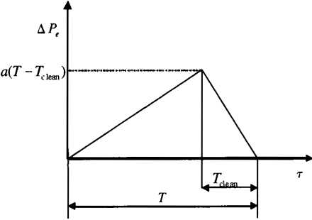通過(guò)測(cè)取機(jī)組清潔率隨時(shí)間變化的曲線,就可以得到由于臟污使汽輪機(jī)排汽壓力Pc隨時(shí)間的變化關(guān)系。即:p,-=fM, ⑴其中,岳為汽輪機(jī)排汽壓力,Pa。由汽輪機(jī)功率Pe隨排汽壓力變化關(guān)系曲線,得:P哉(公),⑵結(jié)合式(1)和式(2),可以得到由于臟污所引起的汽輪機(jī)功率隨時(shí)間的變化式:ARHS),⑶其中,△四為臟污所引起的汽輪機(jī)功率的變化值,kWo當(dāng)清洗系統(tǒng)投入運(yùn)行時(shí),污垢的清除也是逐漸進(jìn)行的,隨著清洗過(guò)程的繼續(xù),由臟污所造成的損失逐漸減小,直至清洗時(shí)間K噸后,臟污所引起的損失達(dá)到零,在清洗過(guò)程中汽輪機(jī)功率隨時(shí)間的變化式如下。AF"),⑷其中,Ape為在清洗過(guò)程中汽輪機(jī)功率的變化值,kW0為簡(jiǎn)化計(jì)算,在不長(zhǎng)的時(shí)間間隔內(nèi),可以將功率損失曲線近似作直線處理,如圖1所示。