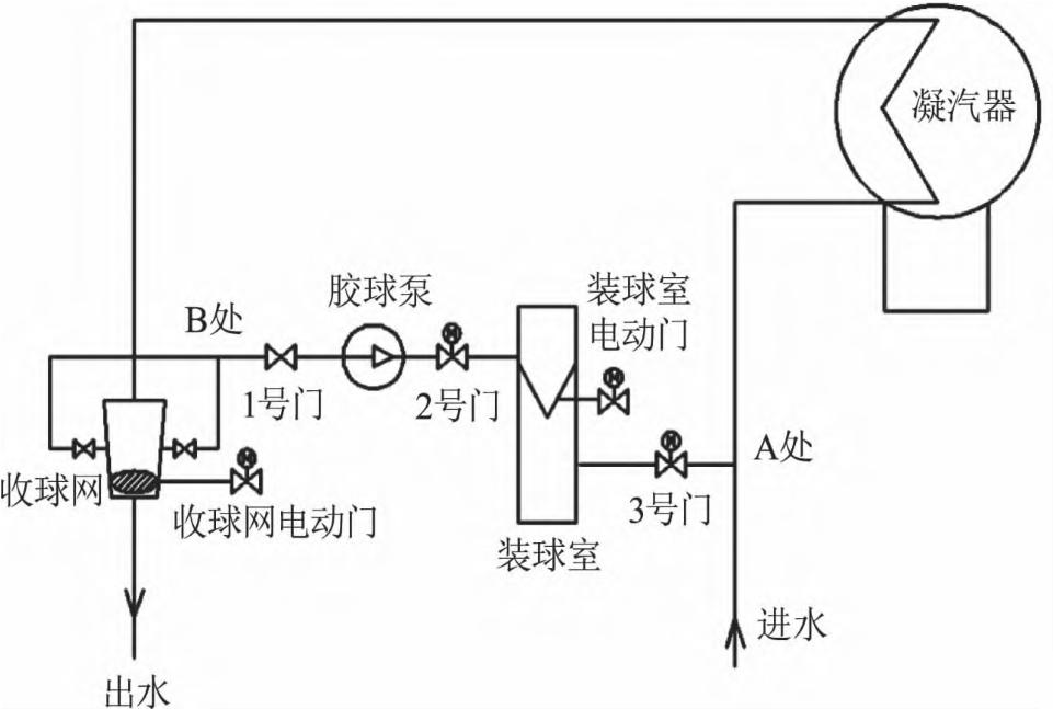 膠球清洗裝置正常運行時,收球網(wǎng)電動閥關閉,膠球泵和1號、2號、3號閥門開啟,膠球泵運行。膠球通過膠球泵的吸力,從凝汽器循環(huán)水出t收球網(wǎng)前打到凝汽器循環(huán)水進t。膠球清洗裝置收球時,關閉裝球電動閥,膠球在膠球泵和循環(huán)水的共同作用下,被帶至裝球內(nèi)。