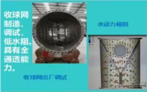 ②收球網(wǎng)網(wǎng)板結(jié)構(gòu)設(shè)計通流能力較低,運行中收球網(wǎng)前后壓差過大導(dǎo)致膠球被擠壓在收球網(wǎng)的網(wǎng)板表面而堵塞流體通道。特別是在蝸;蚝I锘蛩槠绊懴,通流能力顯著降低,導(dǎo)致網(wǎng)板前后有明顯的壓球。因此要求運行中收球網(wǎng)運行壓差+300mm水柱。