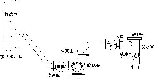2)各管路和彎頭的安裝按圖1進(jìn)行。收球網(wǎng)的出膠球口必須高于膠球泵入口0.5m及以上;各接口有彎頭過(guò)渡連接的,彎頭要大于或等于90。彎徑好大于2.5倍管徑。