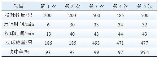 收球網(wǎng)板處于收球位置,將準備好的膠球投入裝球室,該室處于收球位置,打開裝球室出口隔離球閥后,開啟膠球泵,再打開膠球泵出口電動球閥,數(shù)分鐘后投球循環(huán)運行、收球并記錄數(shù)據(jù)。試驗時,凝汽器出口壓力4.2kPa;膠球泵進口壓力9.2kPa,出口壓力12kPa。2號機外環(huán)膠球清洗裝置系統(tǒng)5次試驗數(shù)據(jù)見表4所示。