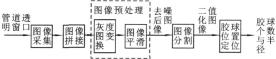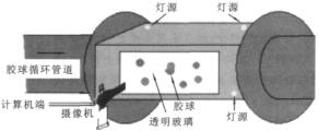 自動監(jiān)測系統(tǒng)示意圖如圖1所示。該系統(tǒng)可以自動地監(jiān)測回收膠球的數(shù)量及其半徑,這樣運行人員就可以根據(jù)檢測結(jié)果適時地添加或更換膠球,保證膠球的數(shù)量以及質(zhì)量,以期達(dá)到佳的清洗效果。通過多次試驗,攝像機(jī)的佳有效位置及其范圍得以確定,并根據(jù)強(qiáng)度承受力和光照特點選擇了合適的材料。本系統(tǒng)硬件配置如圖2所示,其中透明管道材料為鑄造鋼、光學(xué)玻璃,管道內(nèi)側(cè)不同角度裝有頻閃燈,攝像機(jī)拍攝角度垂直于密封玻璃面,拍攝焦距可調(diào)。